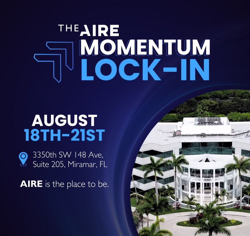 This is the event where agents from all levels come together to grow, share, and build momentum toward lasting success. Whether you’re looking to master your sales or scale your business to new heights, the AIRE Momentum Lock-In will give you the clarity and support you need.